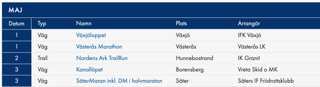 | Pris från och med | Marathon 42km | 1/2 marathon 21km | Mil 10 km |